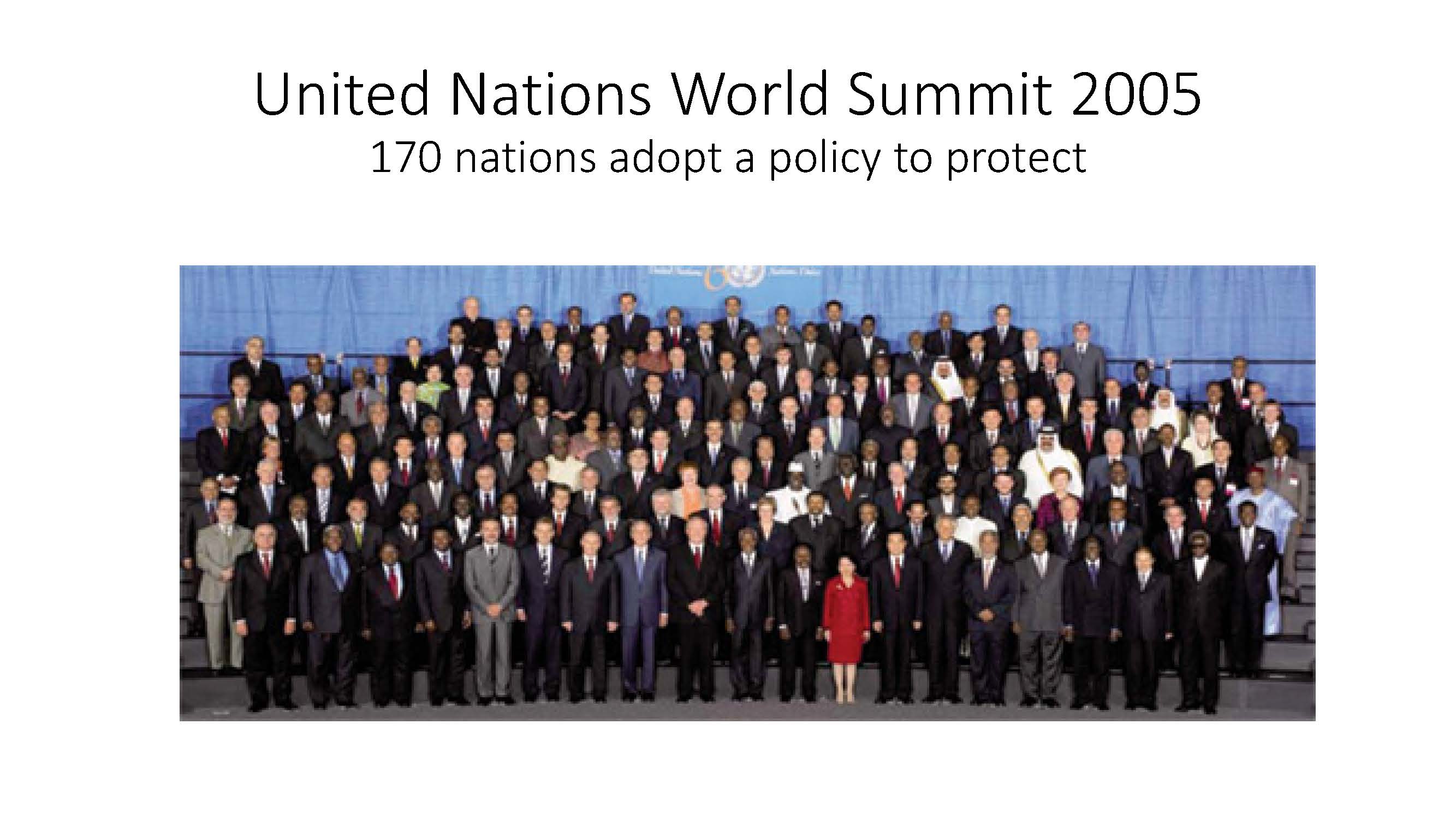 ‘The international community has a duty to step in on behalf of civilians at risk of crimes against humanity, whenever a government is either directly responsible for these crimes or incapable of stopping them’. UN World Summit, New York 2005 – Unanimous Approval by 170 Nations attending.